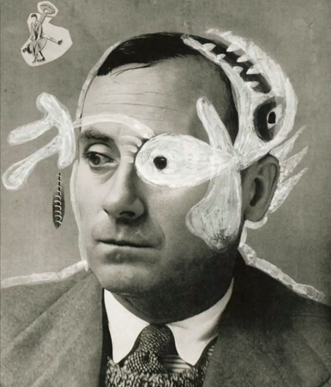 I cannot categorically affirm, in this case, that it is a fish. It could just as well be the flowering of an atypical species, a modest angiospermic eccentricity. It advances across a somewhat recognizable face, that of Joan Miró, and operates in the same manner as those that have concerned us before, replacing an eye with a sign of morphological affinity. It is a portrait that Jan Brzękowski made of the painter, a Polish poet, essayist, and visual artist associated with the European avant-gardes of the interwar period. Brzękowski remained particularly active at the intersection of experimental literature and the visual arts, and maintained—this matters—a close relationship with Surrealism. His work traverses dissimilar languages and, at times, surprising systems of representation.