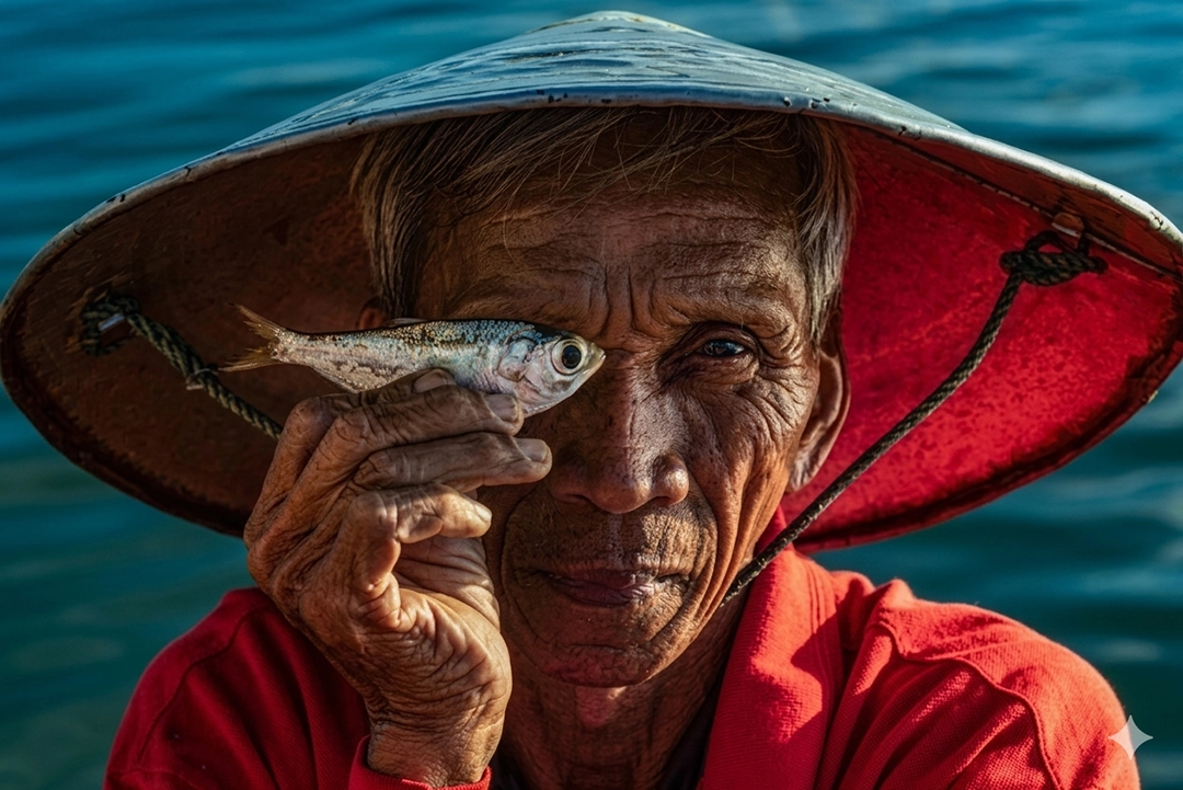 Tran Trong Khai, a photographer from Ho Chi Minh City, stated that the person in the photograph is Mr. Muoi, a local fisherman. He specializes —indeed, makes a living from— recreating scenes of net retrieval, wearing a reddish-orange shirt, for photography tours. He has performed the same gesture —holding a fish up to his eyes— thousands of times for numerous groups of photographers. Khai himself has photographed Mr. Muoi on two occasions, most recently in 2023. However, lacking the appropriate lens, he was only able to capture net-retrieval scenes, not portraits. No prizes. No recognition.