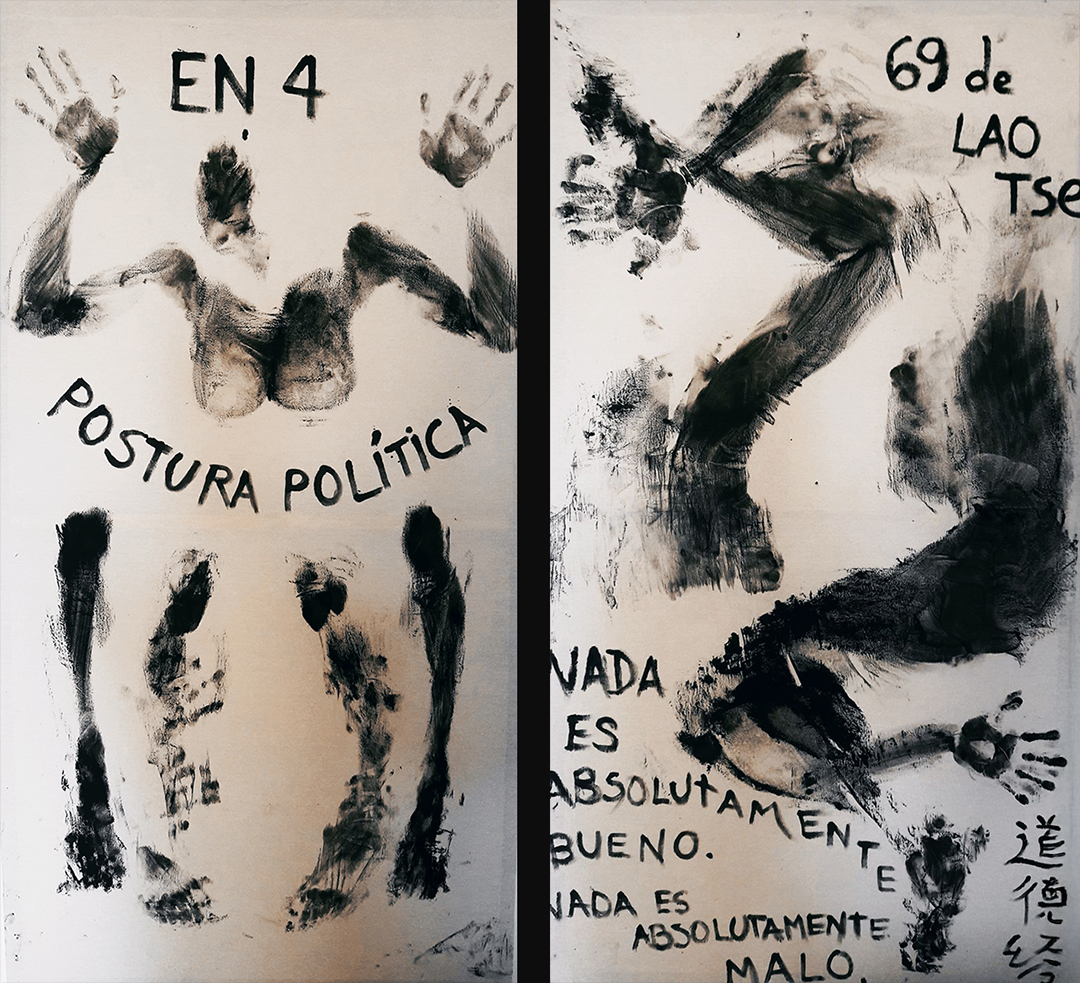 The series Lao Tzu’s 69, Political Posture, and Inverted Lotus (2020) establish one of the central conceptual threads of the exhibition: the relationship between power and the body. Alluding to Yves Klein’s Anthropometries and to the ideological interventions of the Cuban artist Lázaro Saavedra, this triptych fuses Western and Cuban genealogies to question domination—physical, political, and cultural.