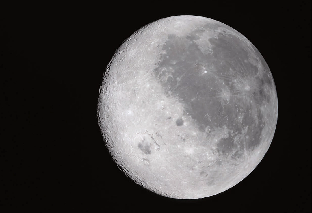 The large shadows on the right are remnants of ancient lava seas, formed when the Moon was still volcanically active. They belong to the near side, the hemisphere visible from Earth. The crater west of the dark expanse is the Orientale basin. Everything to the left falls within the side we cannot observe, since the Moon rotates on its axis at the same rate it orbits our planet.